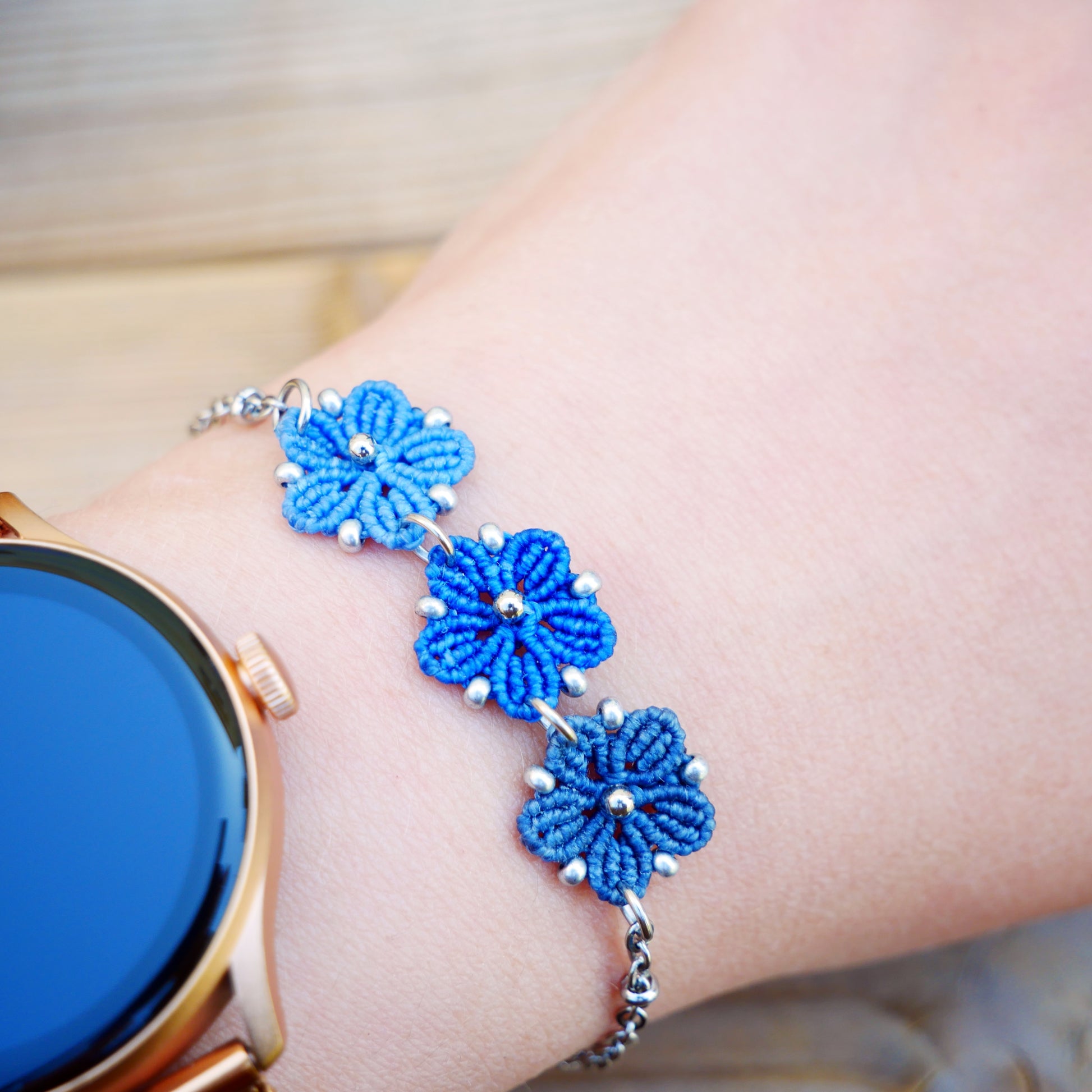 Glisse autour de ton poignet un souffle de ciel et de fraîcheur avec ce bracelet ⟡Blossom⟡ en camaïeu de bleu. Trois petites fleurs tissées en micro-macramé, chacune dans une teinte délicate, évoquent les nuances changeantes de l’eau et du ciel. Elles reposent sur une chaîne perlée réglable, légère comme une brise d’été.
