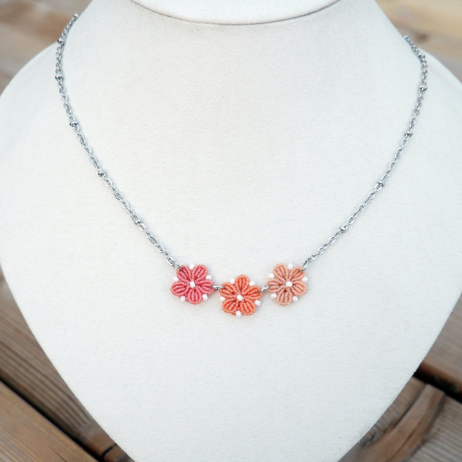 Autour de ton cou, le collier ⟡Blossom⟡ déploie sa douce magie. Trois petites fleurs tissées en micro-macramé dans un camaïeu corail orangé évoquent les derniers rayons d’un soleil d’été, juste avant que le ciel ne s’embrase. Entourées de perles de rocaille blanches, telles des gouttes de rosée posées sur leurs pétales, elles dansent délicatement sur une chaîne perlée, légère comme une brise tiède.