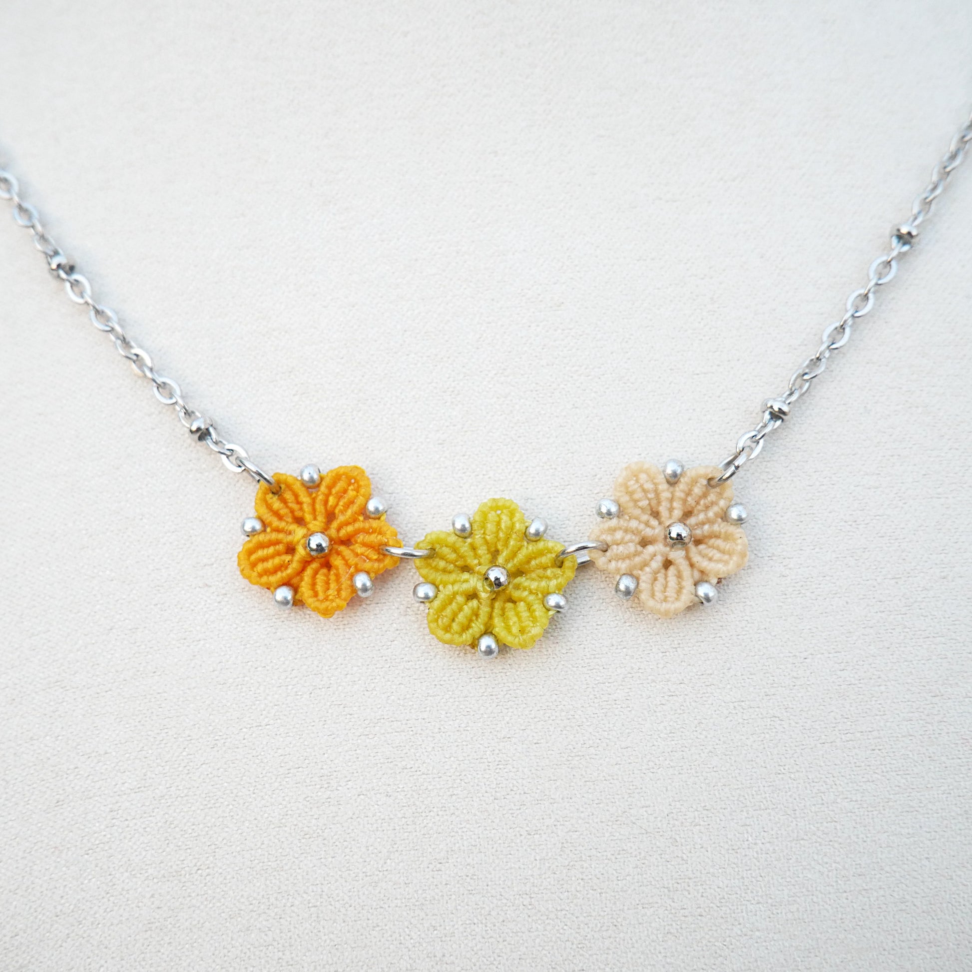 Tu portes avec ce collier ⟡Blossom⟡ un rayon de lumière, une caresse de l’aube cueillie dans un champ de fleurs sauvages. Ses trois petites fleurs tissées à la main, aux nuances délicates de jaune doré, s’épanouissent en un camaïeu lumineux, évoquant le soleil dansant à travers les feuillages.